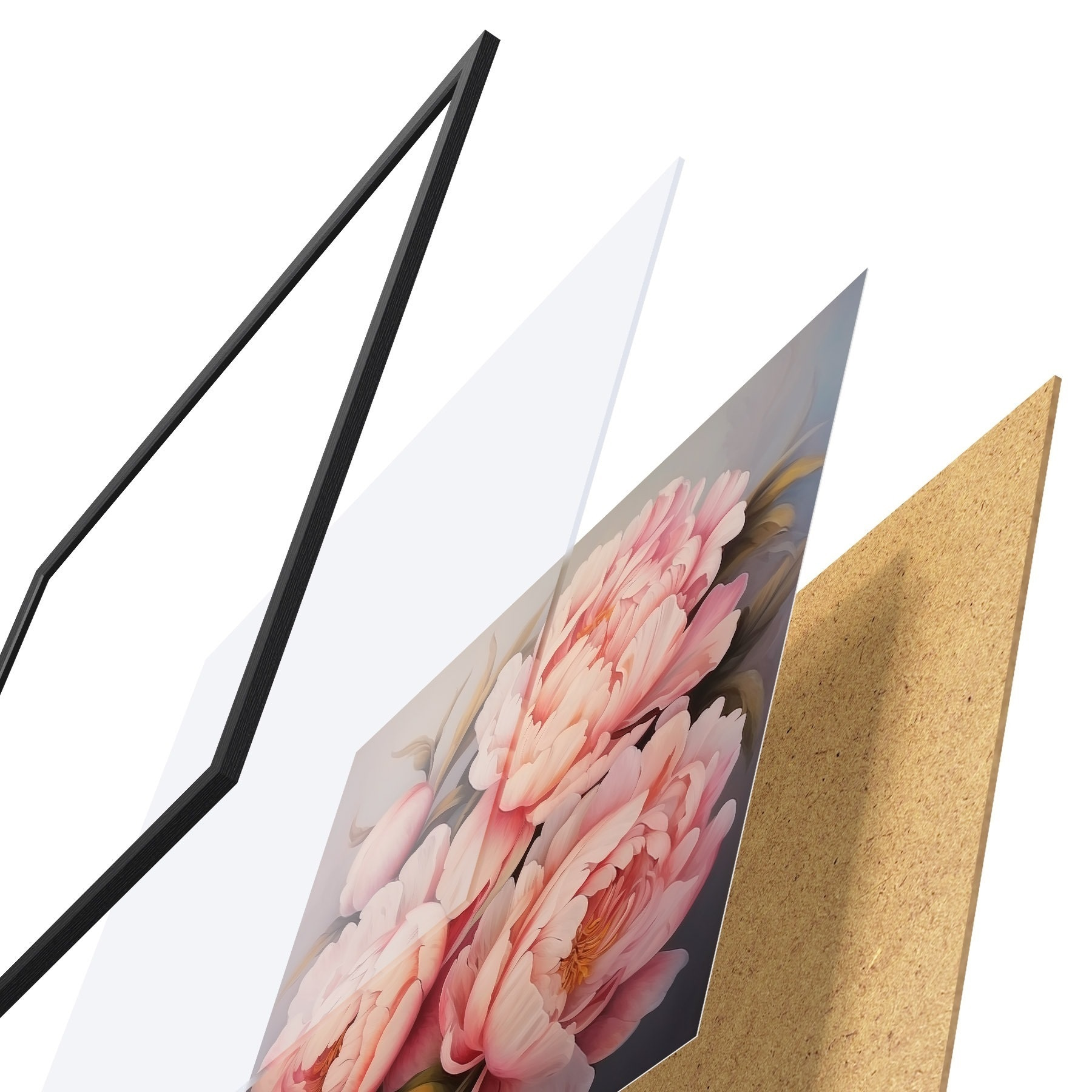 De poster bestaat uit een frame, plexiglas, geprinte afbeelding en spaanplaat achterkant. De poster kan meteen aan de muur worden gehangen dankzij de bevestigingen op de achterkant.