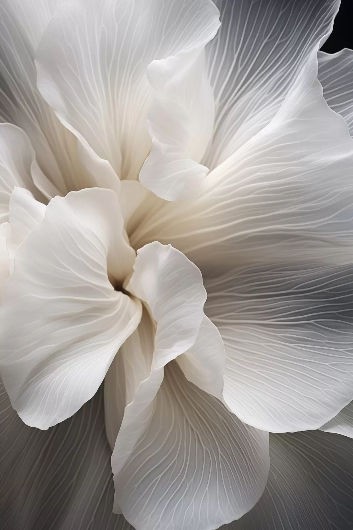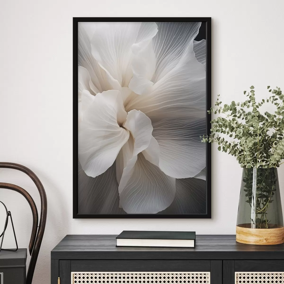 Poster Close-up van delicate abstracte witte bloemblaadjes met ingewikkelde lijnen en een wazige donkere achtergrond Nr f47018