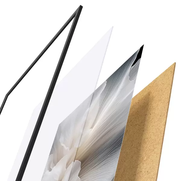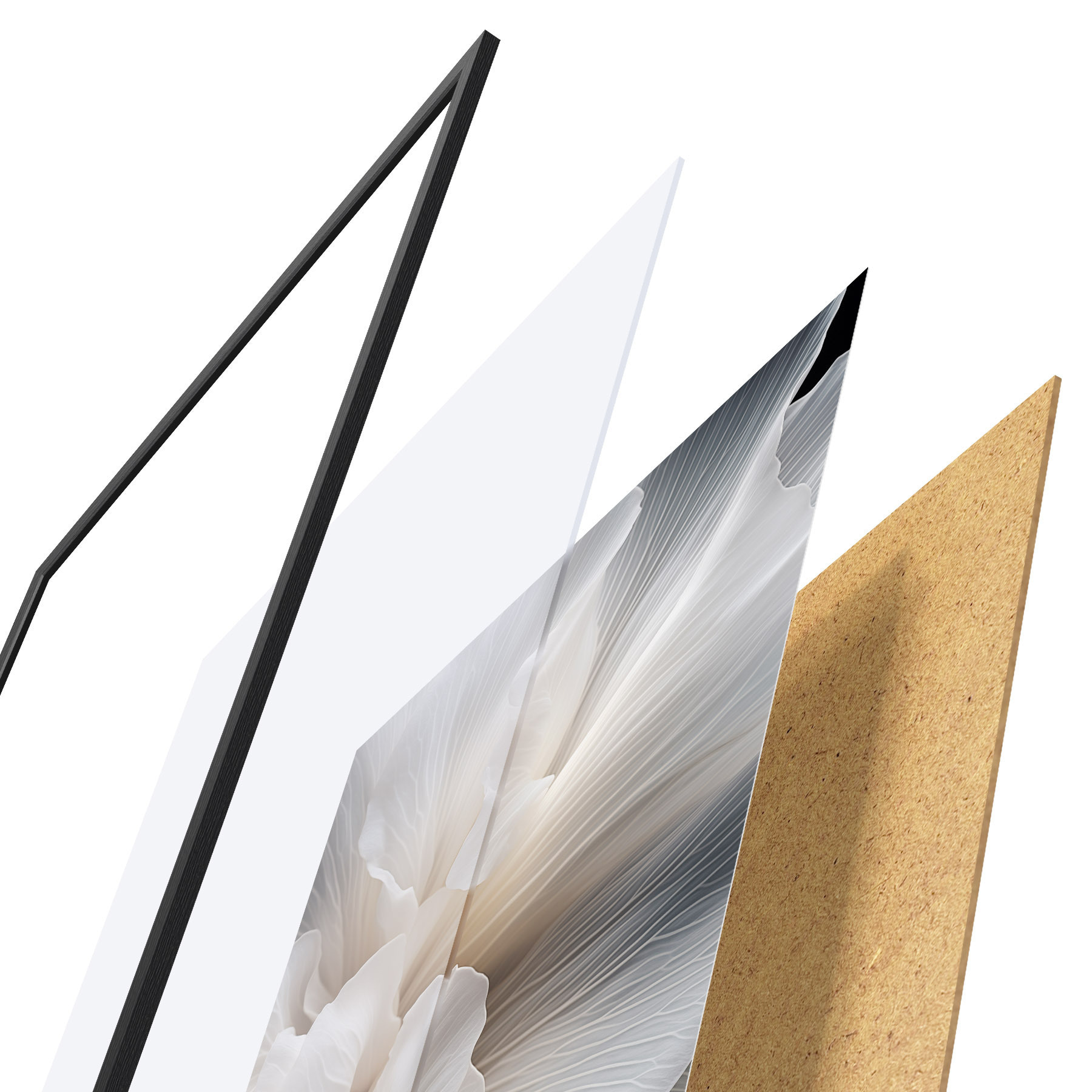 De poster bestaat uit een frame, plexiglas, geprinte afbeelding en spaanplaat achterkant. De poster kan meteen aan de muur worden gehangen dankzij de bevestigingen op de achterkant.