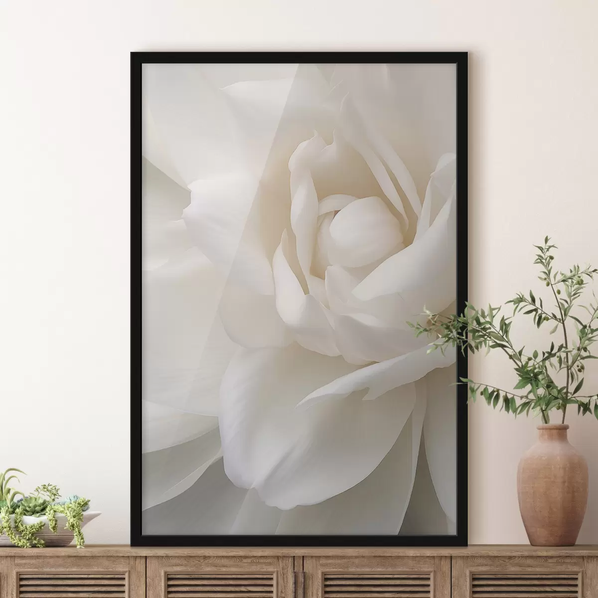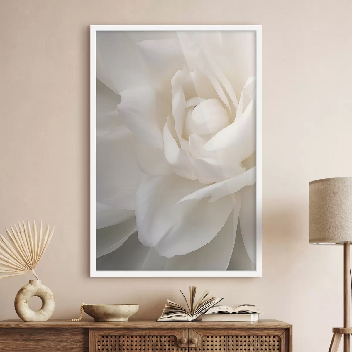 Poster Abstracte witte bloem met delicate, gelaagde bloemblaadjes, minimalistische kunst Nr f47025