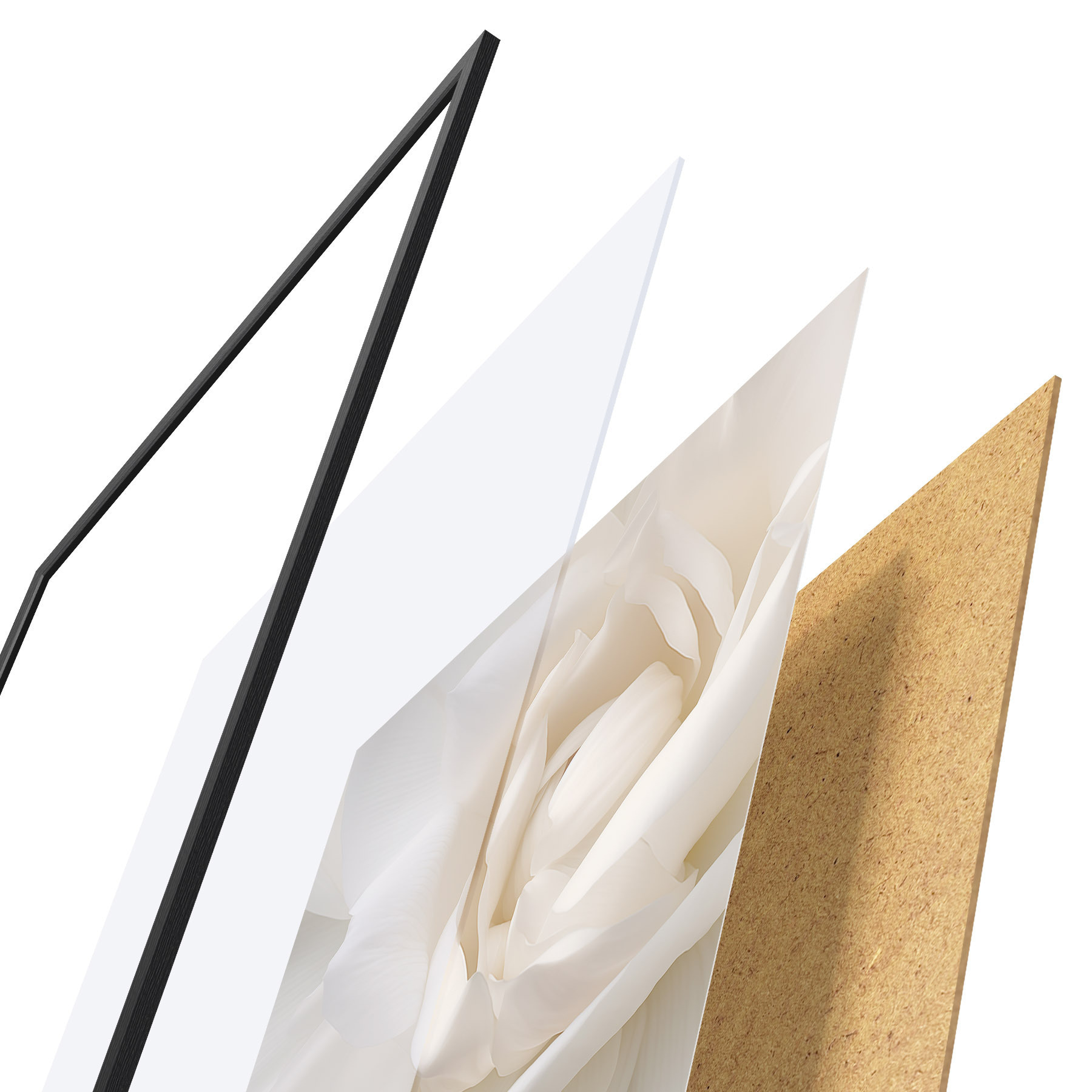 De poster bestaat uit een frame, plexiglas, geprinte afbeelding en spaanplaat achterkant. De poster kan meteen aan de muur worden gehangen dankzij de bevestigingen op de achterkant.