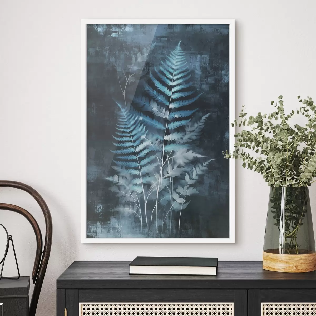 Poster Blauwe varens en planten tegen een donkere, gestructureerde achtergrond, met de nadruk op de ingewikkelde details, röntgeneffect f47026