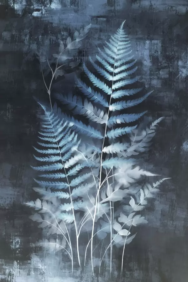 Poster Blauwe varens en planten tegen een donkere, gestructureerde achtergrond, met de nadruk op de ingewikkelde details, röntgeneffect f47026