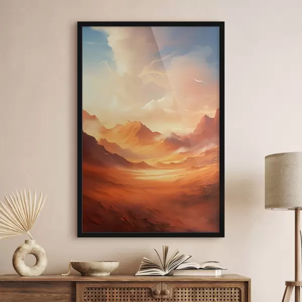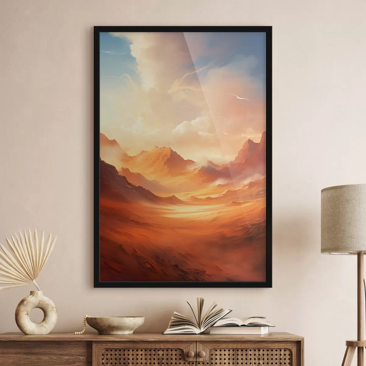 Poster Een uitgestrekt, oranje woestijnlandschap met torenhoge, rotsachtige bergen onder een wazige, zonovergoten hemel met dunne wolken Nr f47028