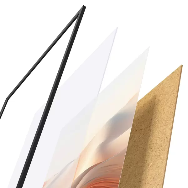 De poster bestaat uit een frame, plexiglas, geprinte afbeelding en spaanplaat achterkant. De poster kan meteen aan de muur worden gehangen dankzij de bevestigingen op de achterkant.