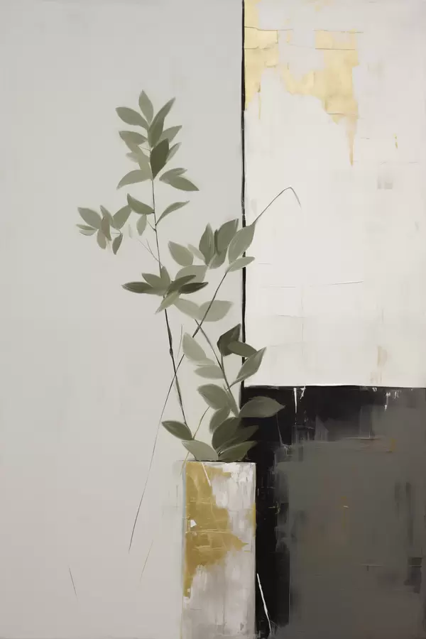 Poster Een minimalistisch schilderij met textuur van een vaas met groene bladeren tegen een achtergrond van abstracte geometrische vormen Nr f47036