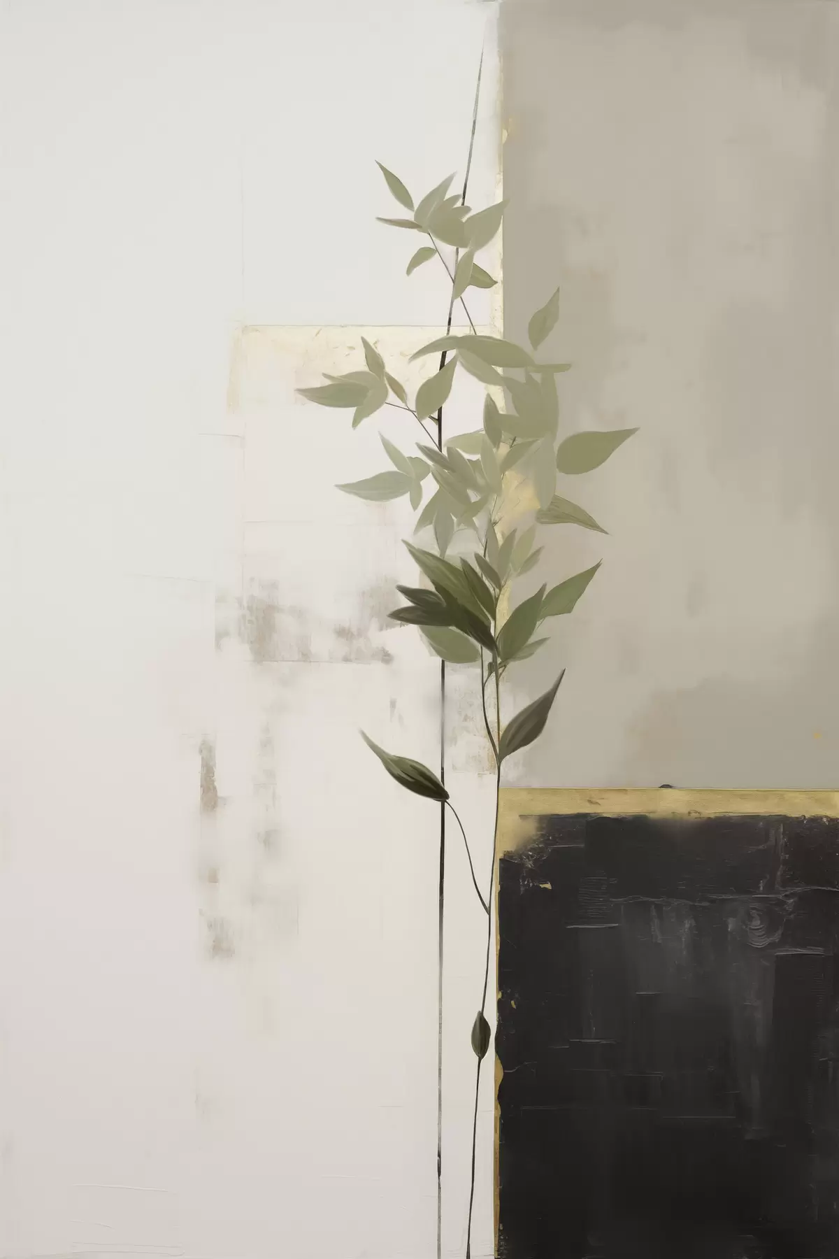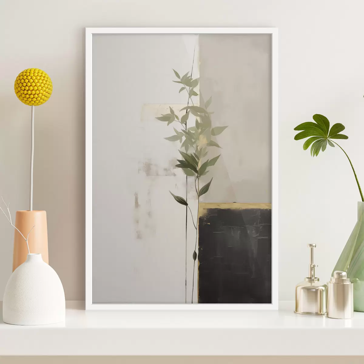 Poster Een minimalistisch schilderij met textuur van een vaas met groene bladeren tegen een achtergrond van abstracte geometrische vormen Nr f47037