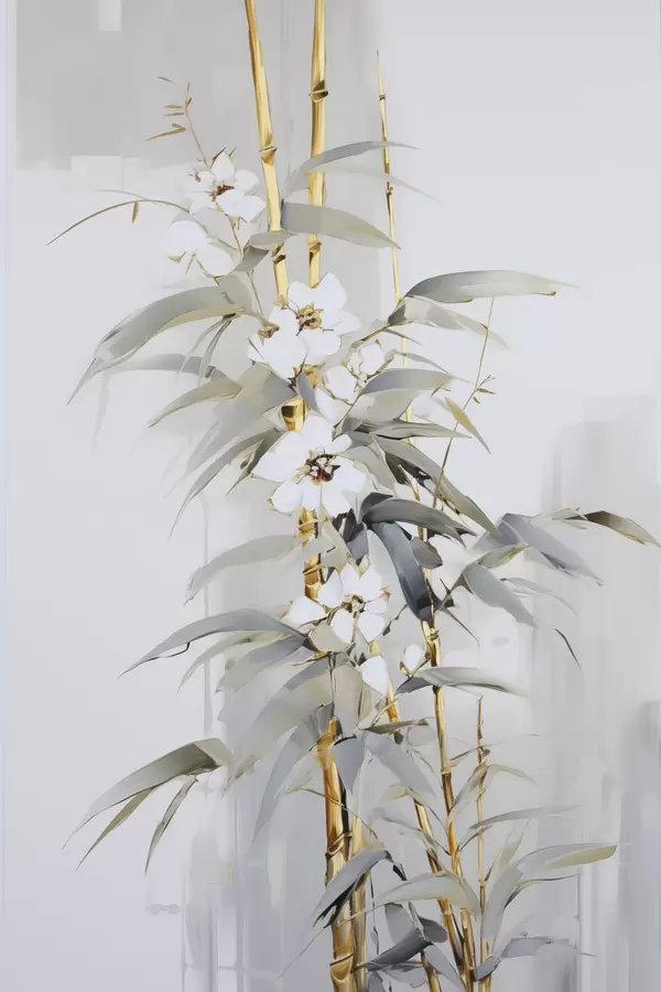 Poster Abstracte bamboestengels met gele accenten, delicate witte bloemen en lichtgroene bladeren, grijze achtergrond Nr f47039