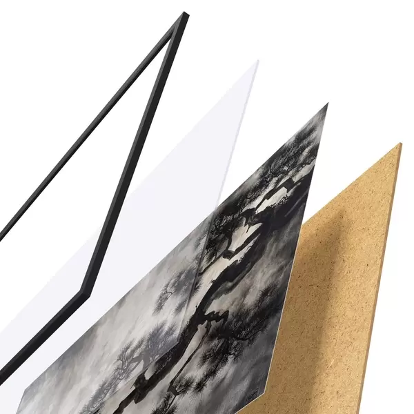De poster bestaat uit een frame, plexiglas, geprinte afbeelding en spaanplaat achterkant. De poster kan meteen aan de muur worden gehangen dankzij de bevestigingen op de achterkant.