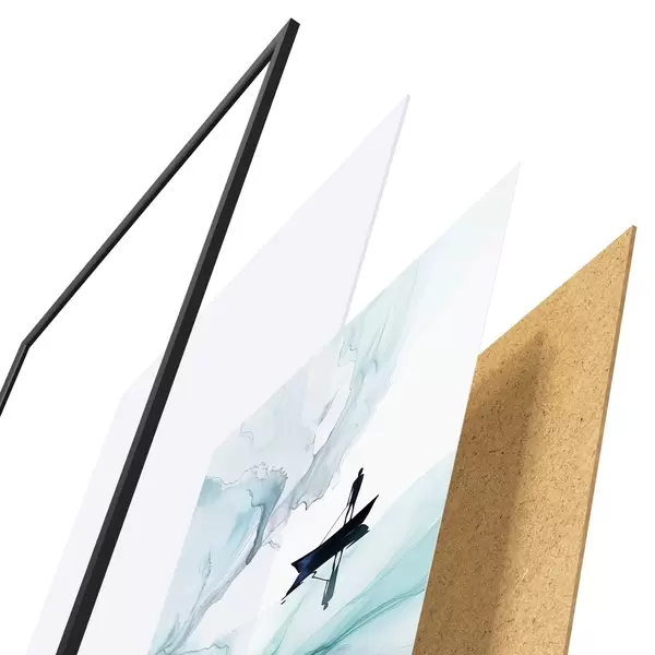 De poster bestaat uit een frame, plexiglas, geprinte afbeelding en spaanplaat achterkant. De poster kan meteen aan de muur worden gehangen dankzij de bevestigingen op de achterkant.