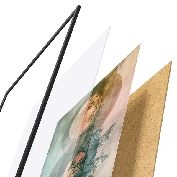 De poster bestaat uit een frame, plexiglas, geprinte afbeelding en spaanplaat achterkant. De poster kan meteen aan de muur worden gehangen dankzij de bevestigingen op de achterkant.