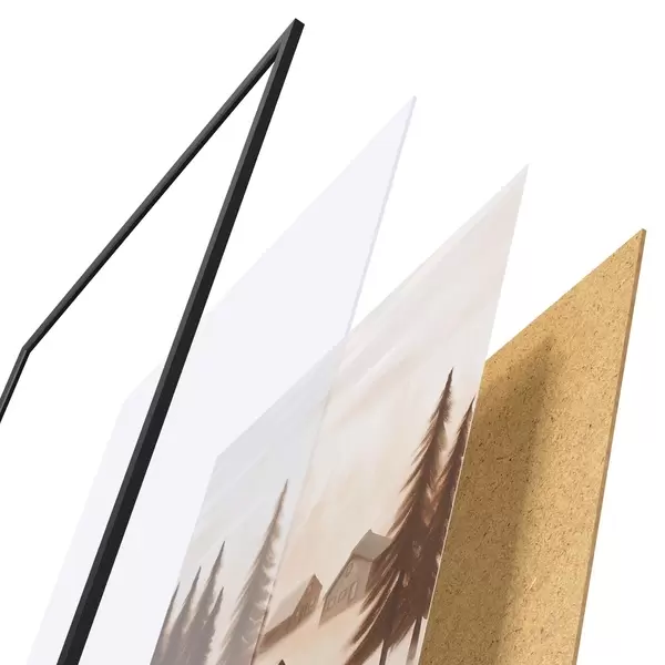 De poster bestaat uit een frame, plexiglas, geprinte afbeelding en spaanplaat achterkant. De poster kan meteen aan de muur worden gehangen dankzij de bevestigingen op de achterkant.