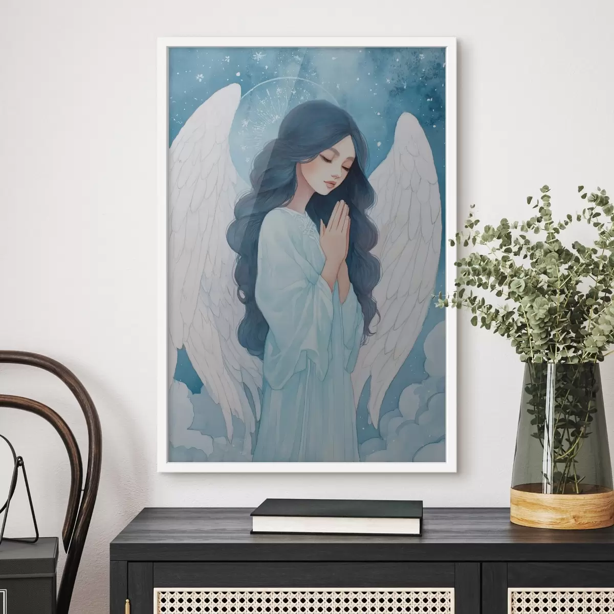 Poster Charmante illustratie van een engel tussen wolken in een wit en blauw kleurenpalet Nr f47095
