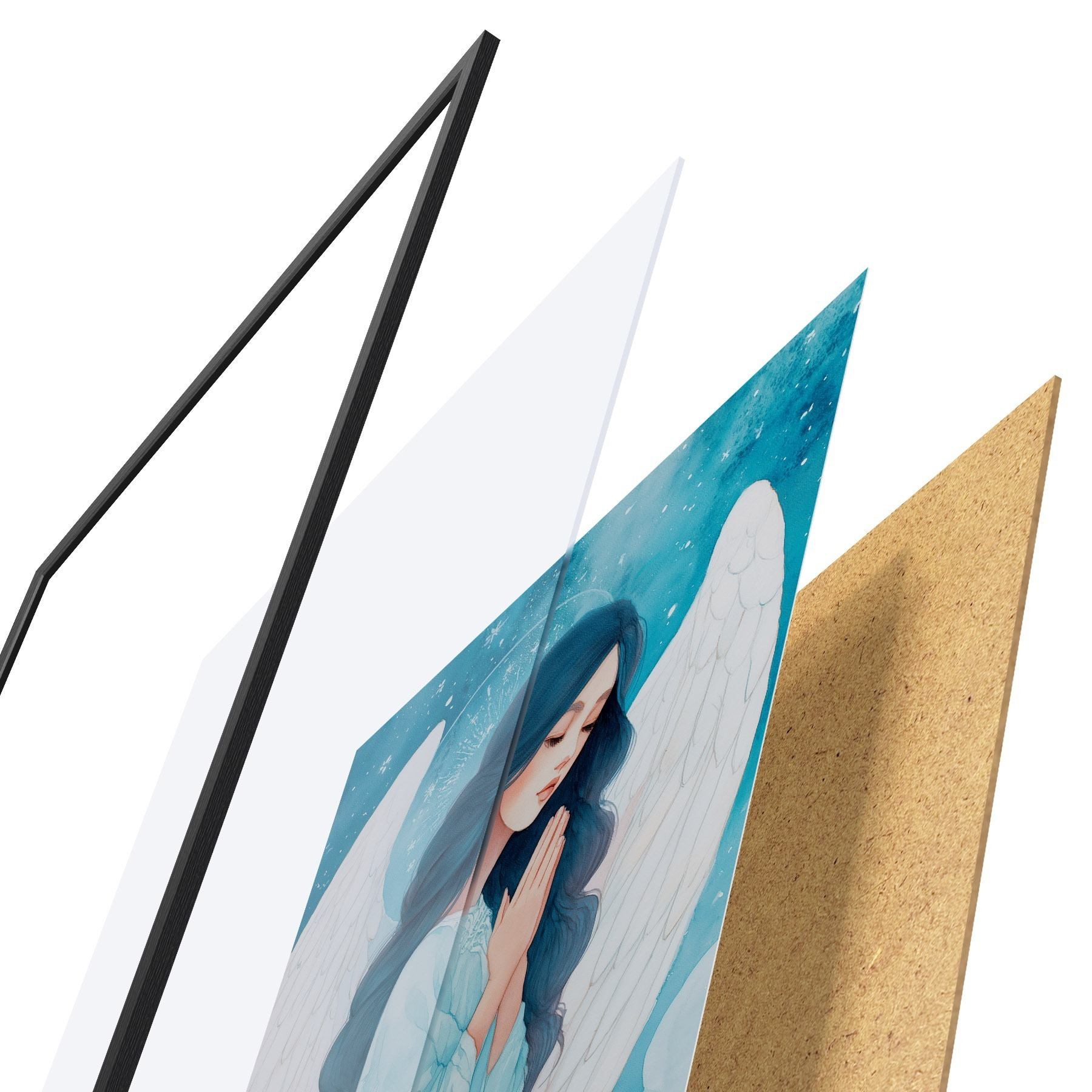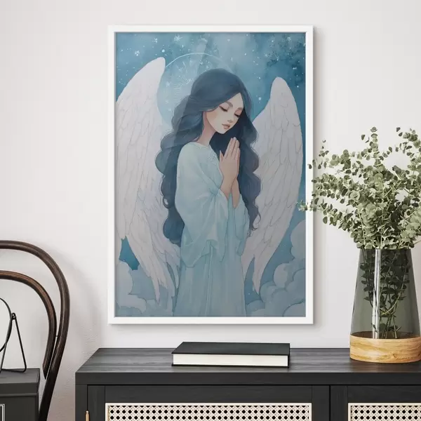 Poster Charmante illustratie van een engel tussen wolken in een wit en blauw kleurenpalet f47095