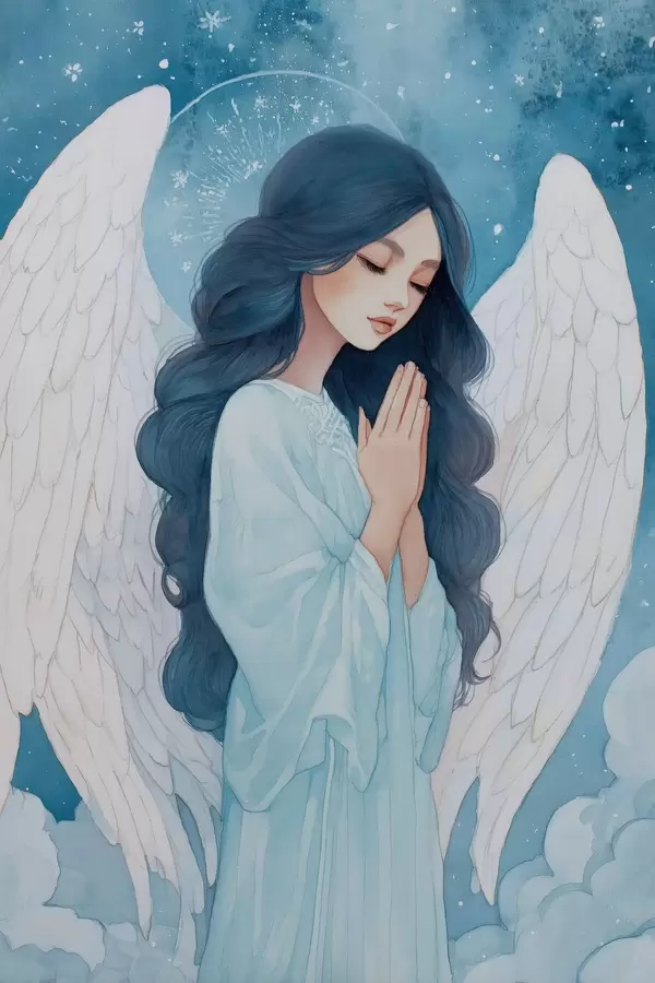 Poster Charmante illustratie van een engel tussen wolken in een wit en blauw kleurenpalet Nr f47095