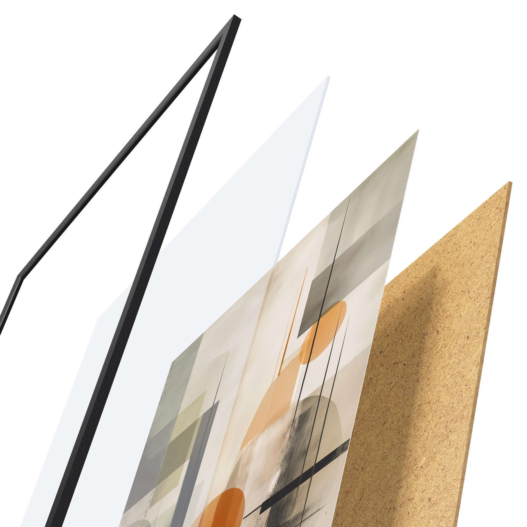 De poster bestaat uit een frame, plexiglas, geprinte afbeelding en spaanplaat achterkant. De poster kan meteen aan de muur worden gehangen dankzij de bevestigingen op de achterkant.