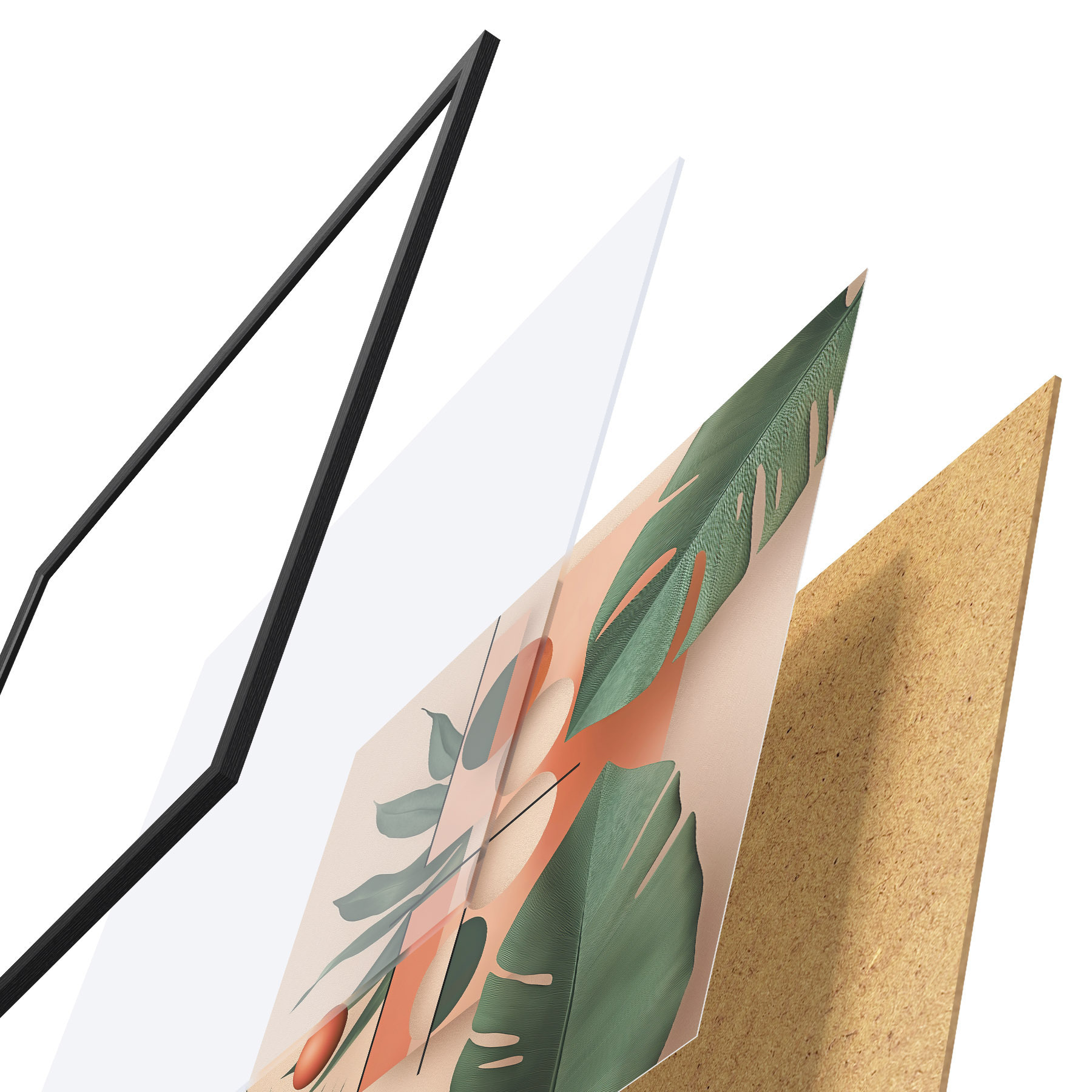 De poster bestaat uit een frame, plexiglas, geprinte afbeelding en spaanplaat achterkant. De poster kan meteen aan de muur worden gehangen dankzij de bevestigingen op de achterkant.