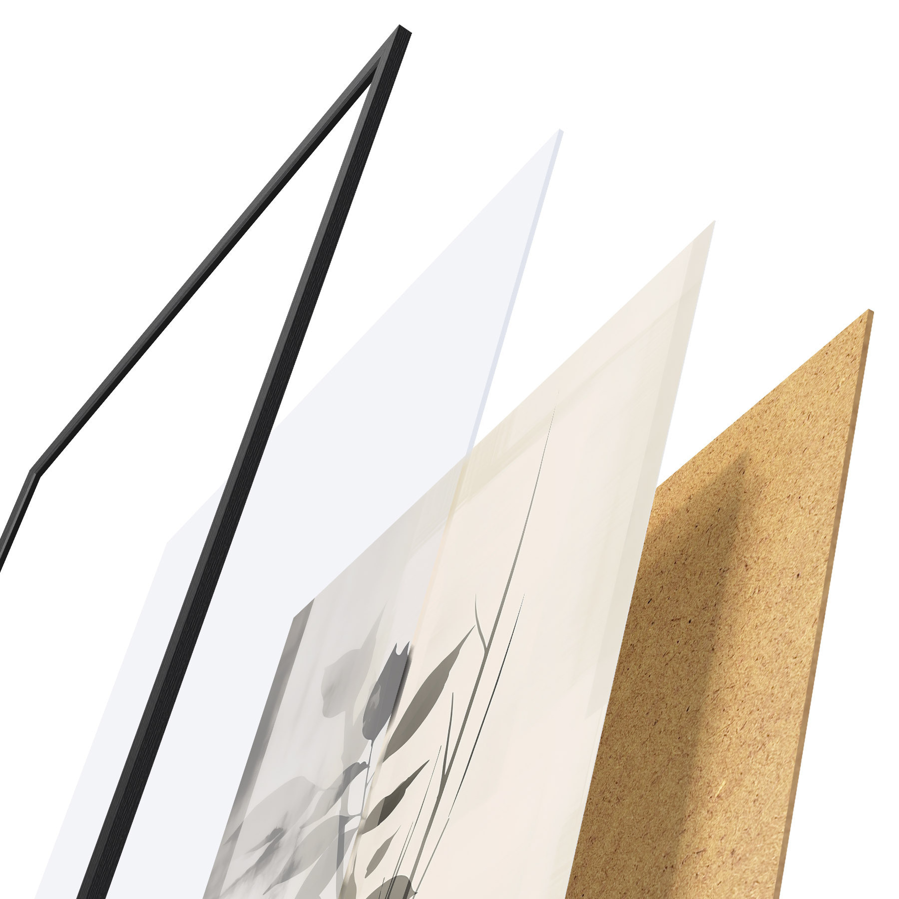De poster bestaat uit een frame, plexiglas, geprinte afbeelding en spaanplaat achterkant. De poster kan meteen aan de muur worden gehangen dankzij de bevestigingen op de achterkant.