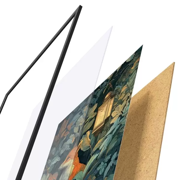 De poster bestaat uit een frame, plexiglas, geprinte afbeelding en spaanplaat achterkant. De poster kan meteen aan de muur worden gehangen dankzij de bevestigingen op de achterkant.