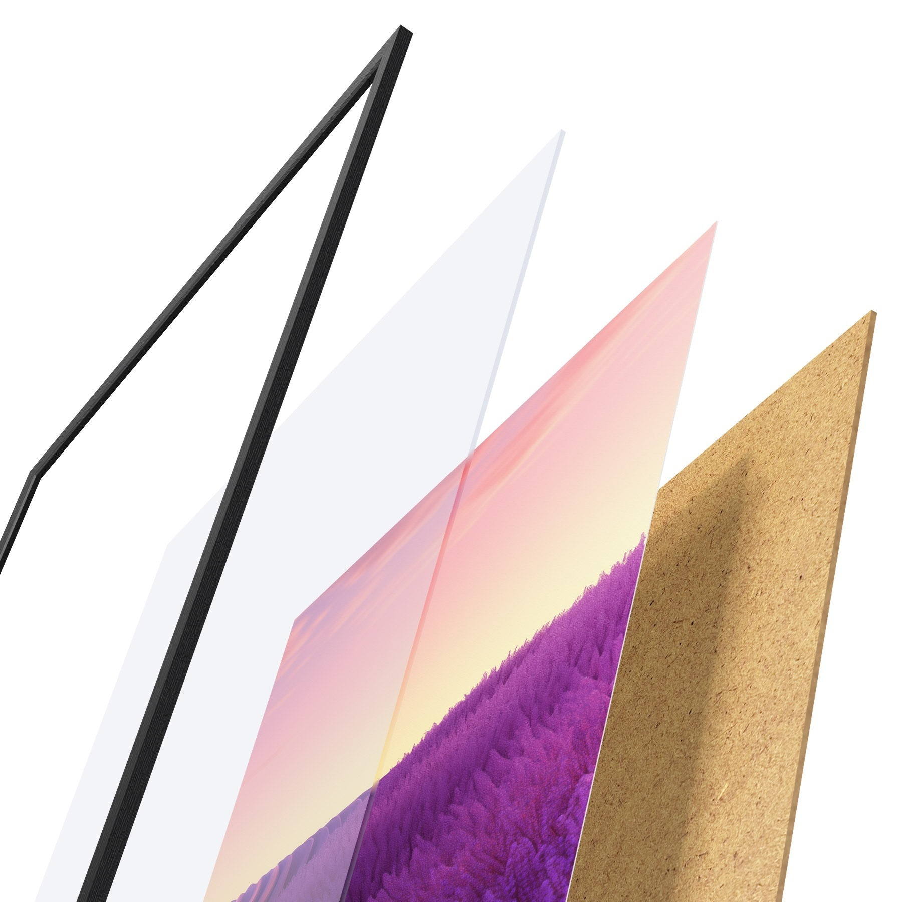 De poster bestaat uit een frame, plexiglas, geprinte afbeelding en spaanplaat achterkant. De poster kan meteen aan de muur worden gehangen dankzij de bevestigingen op de achterkant.
