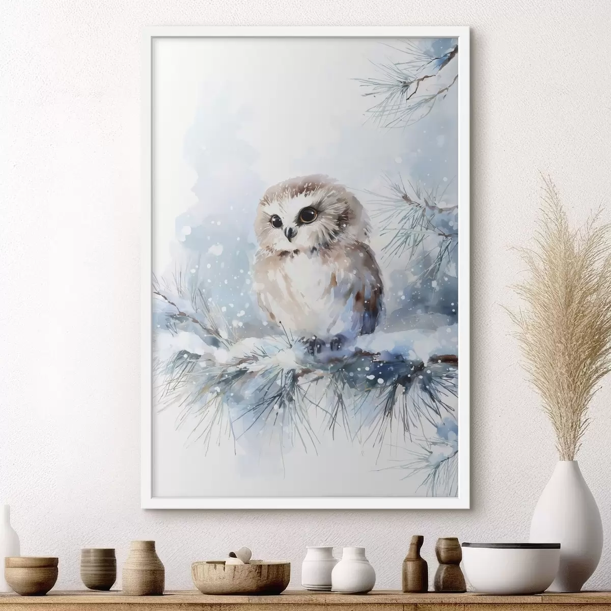 Poster schattige uil op een met sneeuw bedekte dennenboomtak in aquarelstijl Nr f47115