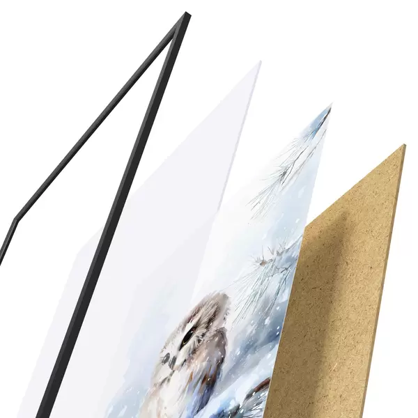 De poster bestaat uit een frame, plexiglas, geprinte afbeelding en spaanplaat achterkant. De poster kan meteen aan de muur worden gehangen dankzij de bevestigingen op de achterkant.