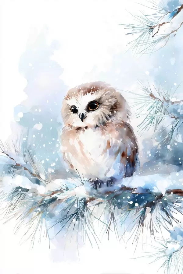 Poster schattige uil op een met sneeuw bedekte dennenboomtak in aquarelstijl Nr f47115