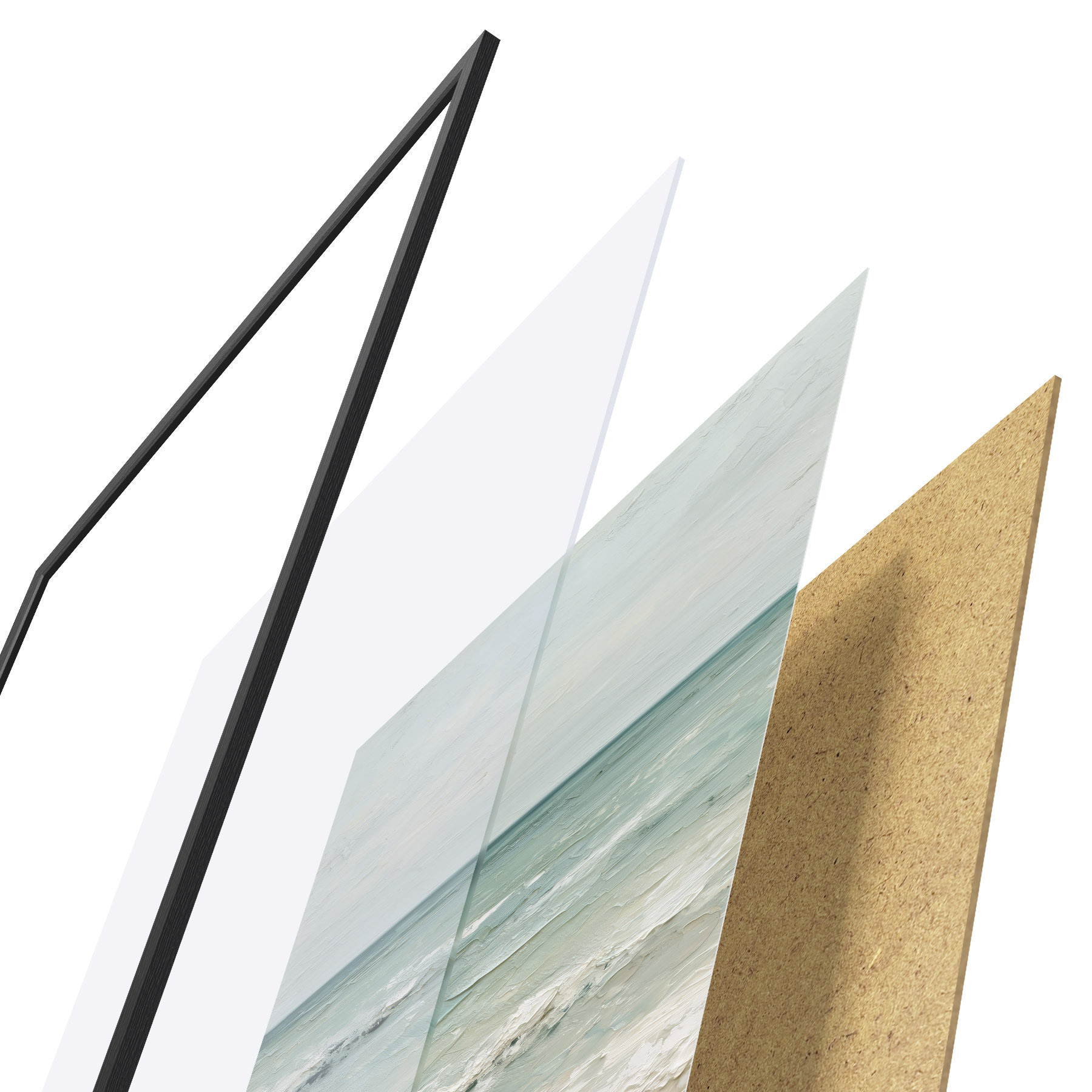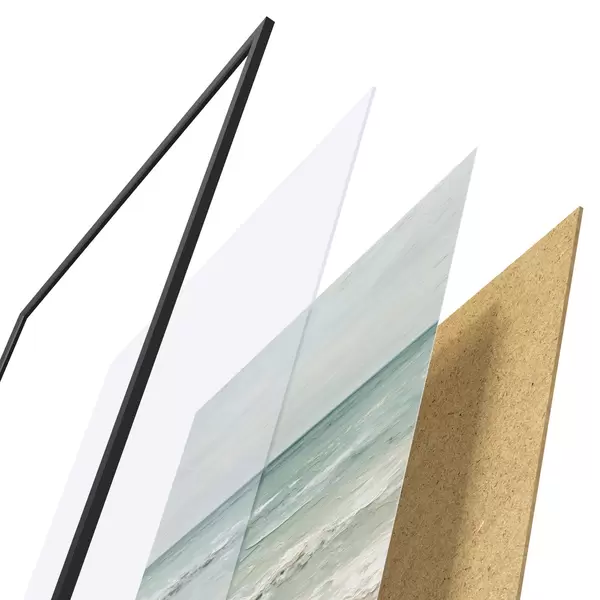 De poster bestaat uit een frame, plexiglas, geprinte afbeelding en spaanplaat achterkant. De poster kan meteen aan de muur worden gehangen dankzij de bevestigingen op de achterkant.