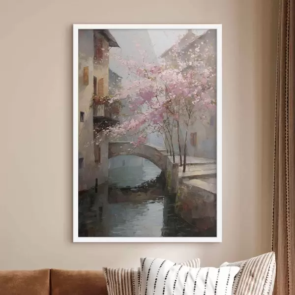 Poster romantisch stadsgezicht met een bloeiende boom in de stijl van een olieverfschilderij Nr f47127