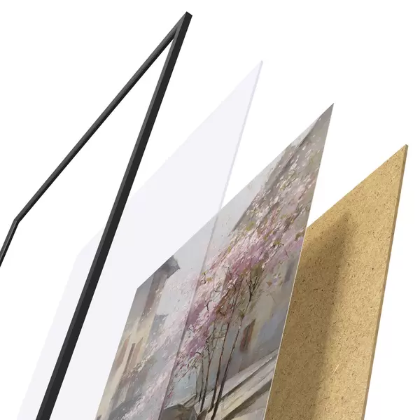 De poster bestaat uit een frame, plexiglas, geprinte afbeelding en spaanplaat achterkant. De poster kan meteen aan de muur worden gehangen dankzij de bevestigingen op de achterkant.