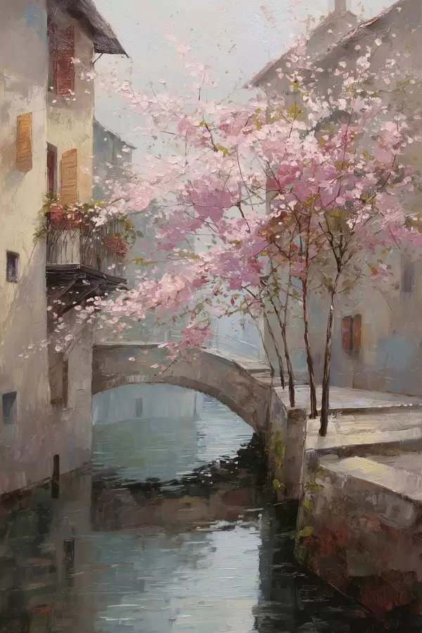 Poster romantisch stadsgezicht met een bloeiende boom in de stijl van een olieverfschilderij Nr f47127