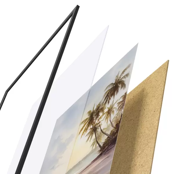 De poster bestaat uit een frame, plexiglas, geprinte afbeelding en spaanplaat achterkant. De poster kan meteen aan de muur worden gehangen dankzij de bevestigingen op de achterkant.