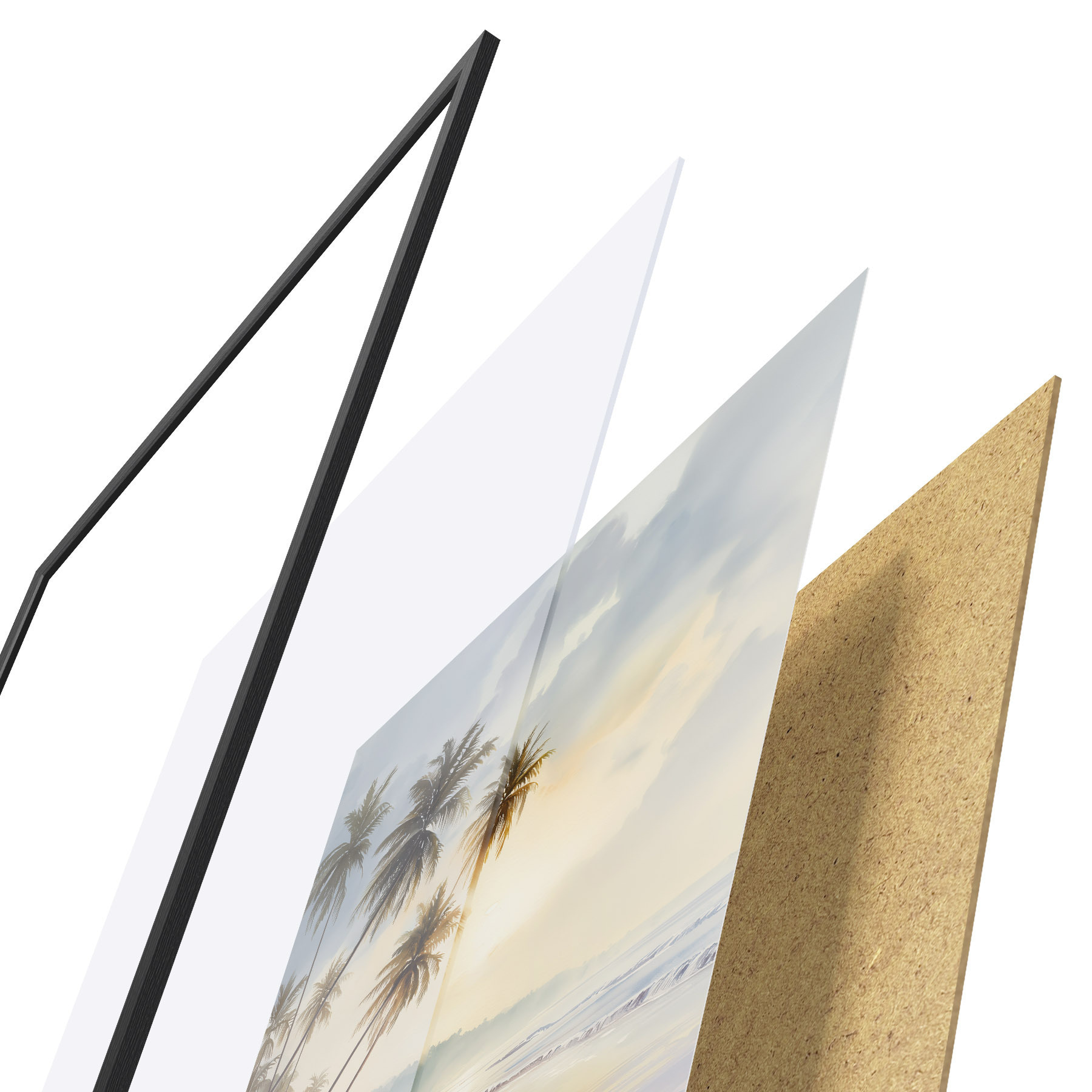De poster bestaat uit een frame, plexiglas, geprinte afbeelding en spaanplaat achterkant. De poster kan meteen aan de muur worden gehangen dankzij de bevestigingen op de achterkant.