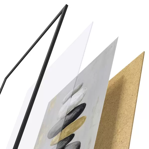 De poster bestaat uit een frame, plexiglas, geprinte afbeelding en spaanplaat achterkant. De poster kan meteen aan de muur worden gehangen dankzij de bevestigingen op de achterkant.