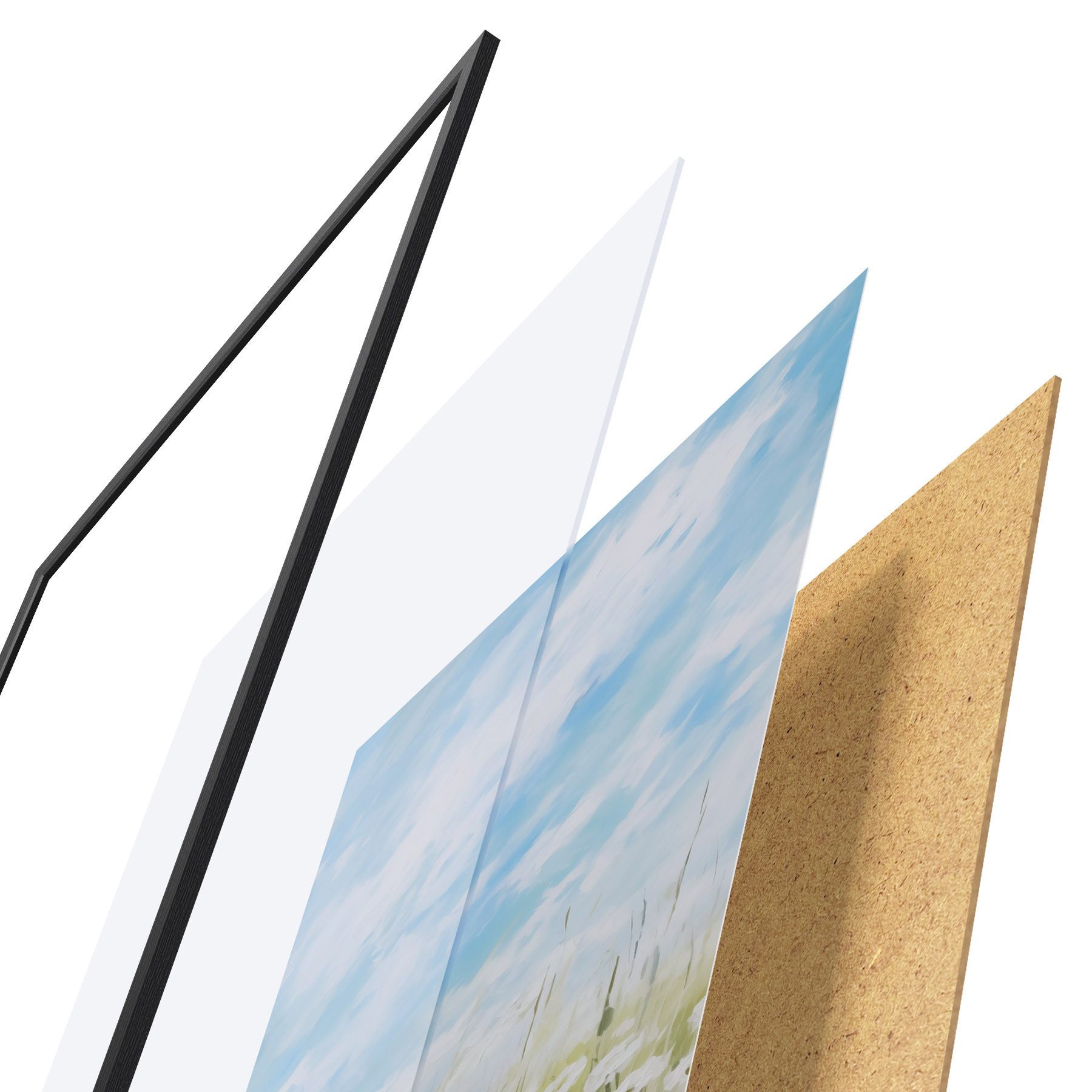 De poster bestaat uit een frame, plexiglas, geprinte afbeelding en spaanplaat achterkant. De poster kan meteen aan de muur worden gehangen dankzij de bevestigingen op de achterkant.