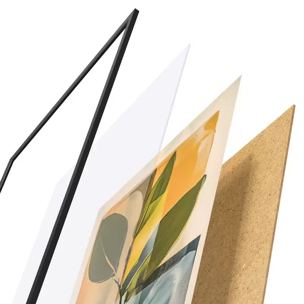 De poster bestaat uit een frame, plexiglas, geprinte afbeelding en spaanplaat achterkant. De poster kan meteen aan de muur worden gehangen dankzij de bevestigingen op de achterkant.