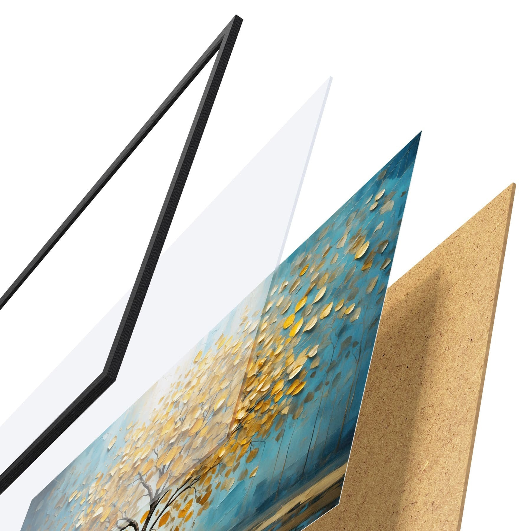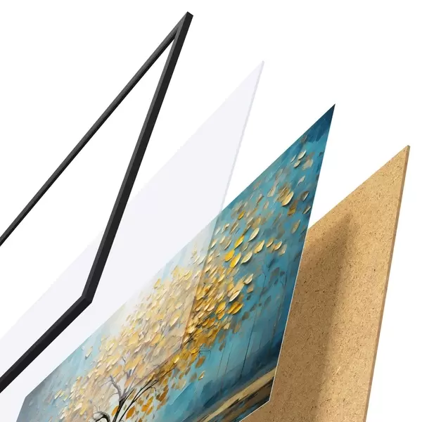 De poster bestaat uit een frame, plexiglas, geprinte afbeelding en spaanplaat achterkant. De poster kan meteen aan de muur worden gehangen dankzij de bevestigingen op de achterkant.