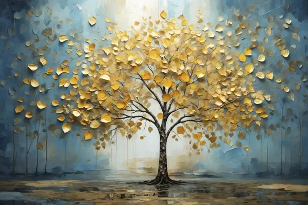 Poster Boom met gele bladeren tegen blauwe achtergrond Nr f47256