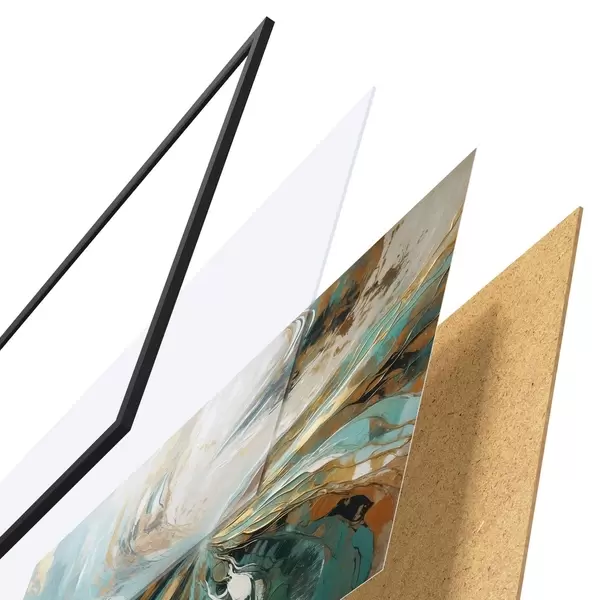 De poster bestaat uit een frame, plexiglas, geprinte afbeelding en spaanplaat achterkant. De poster kan meteen aan de muur worden gehangen dankzij de bevestigingen op de achterkant.