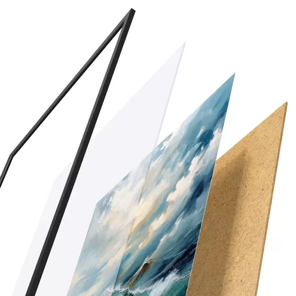 De poster bestaat uit een frame, plexiglas, geprinte afbeelding en spaanplaat achterkant. De poster kan meteen aan de muur worden gehangen dankzij de bevestigingen op de achterkant.
