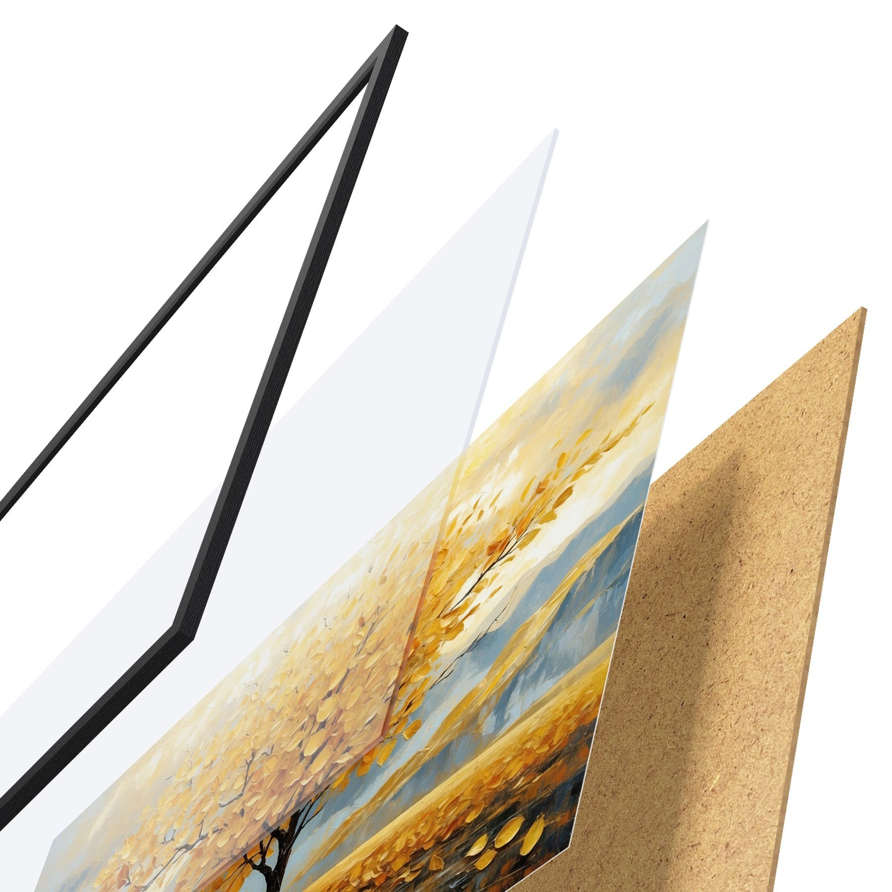 De poster bestaat uit een frame, plexiglas, geprinte afbeelding en spaanplaat achterkant. De poster kan meteen aan de muur worden gehangen dankzij de bevestigingen op de achterkant.