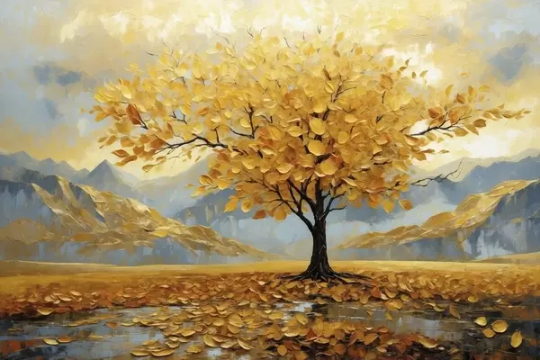 Poster Boom met gele bladeren in een berglandschap Nr f47285