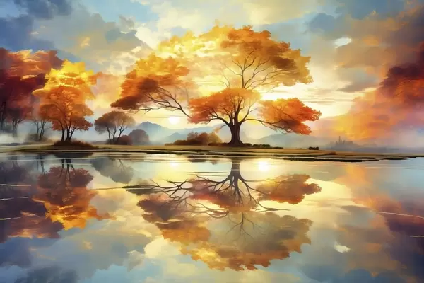 Poster Levendige bomen weerspiegeld in het water Nr f47287