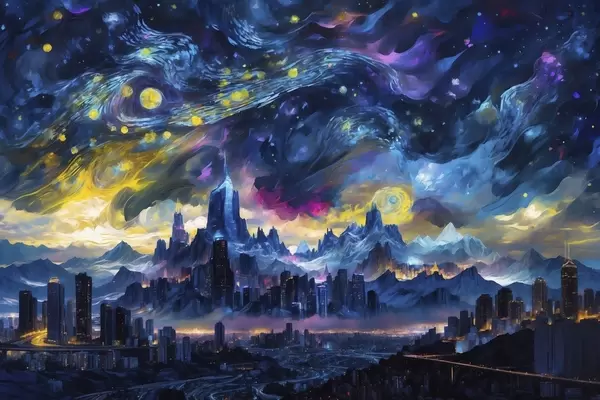 Poster Fantasie stad onder een stralende nachtelijke hemel Nr f47288