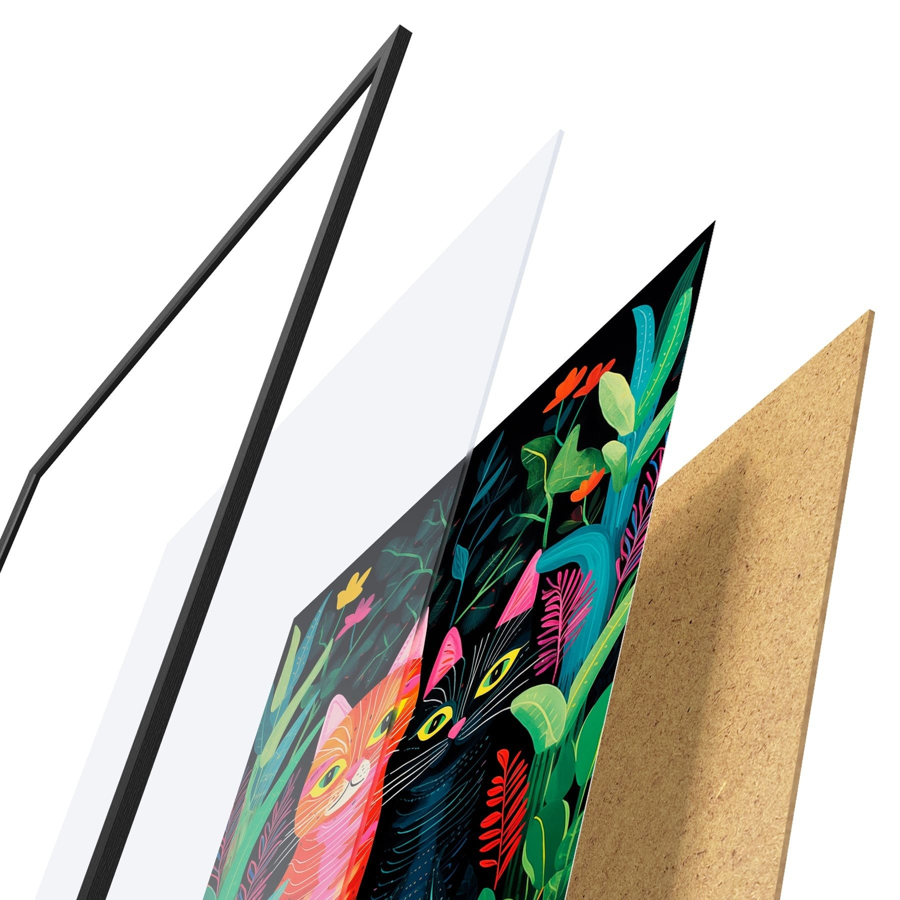 De poster bestaat uit een frame, plexiglas, geprinte afbeelding en spaanplaat achterkant. De poster kan meteen aan de muur worden gehangen dankzij de bevestigingen op de achterkant.