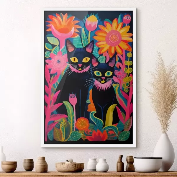 Poster Twee zwarte katten tussen heldere bloemen Nr f47299
