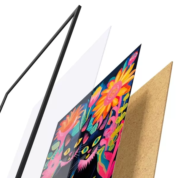 De poster bestaat uit een frame, plexiglas, geprinte afbeelding en spaanplaat achterkant. De poster kan meteen aan de muur worden gehangen dankzij de bevestigingen op de achterkant.