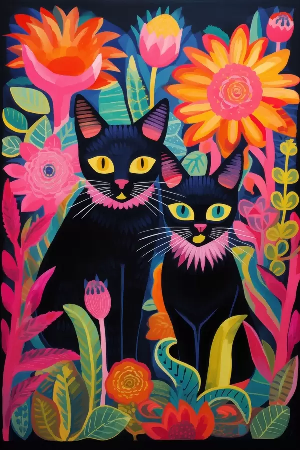 Poster Twee zwarte katten tussen heldere bloemen Nr f47299