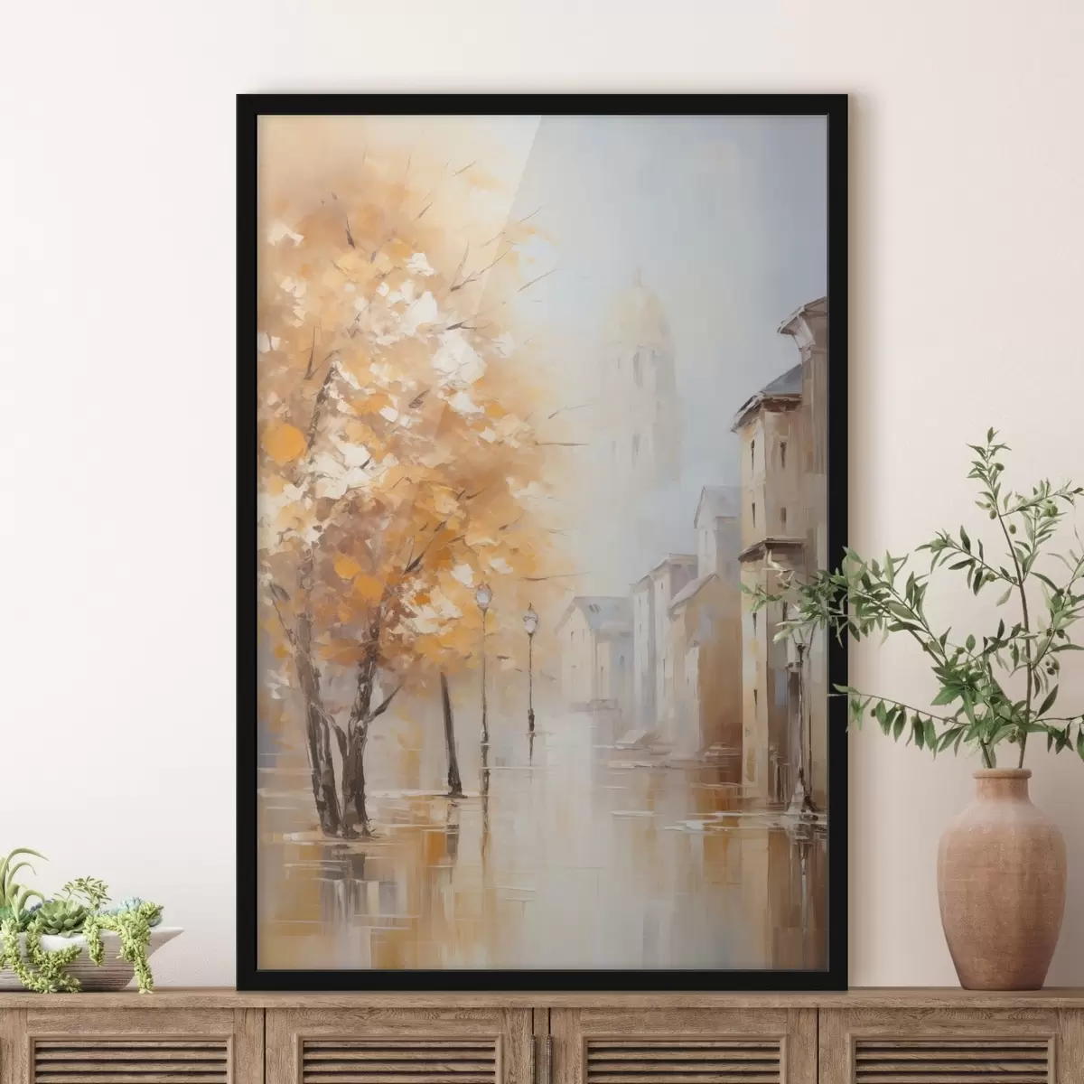Poster Straat met bomen en een koepel in de mist Nr f47304