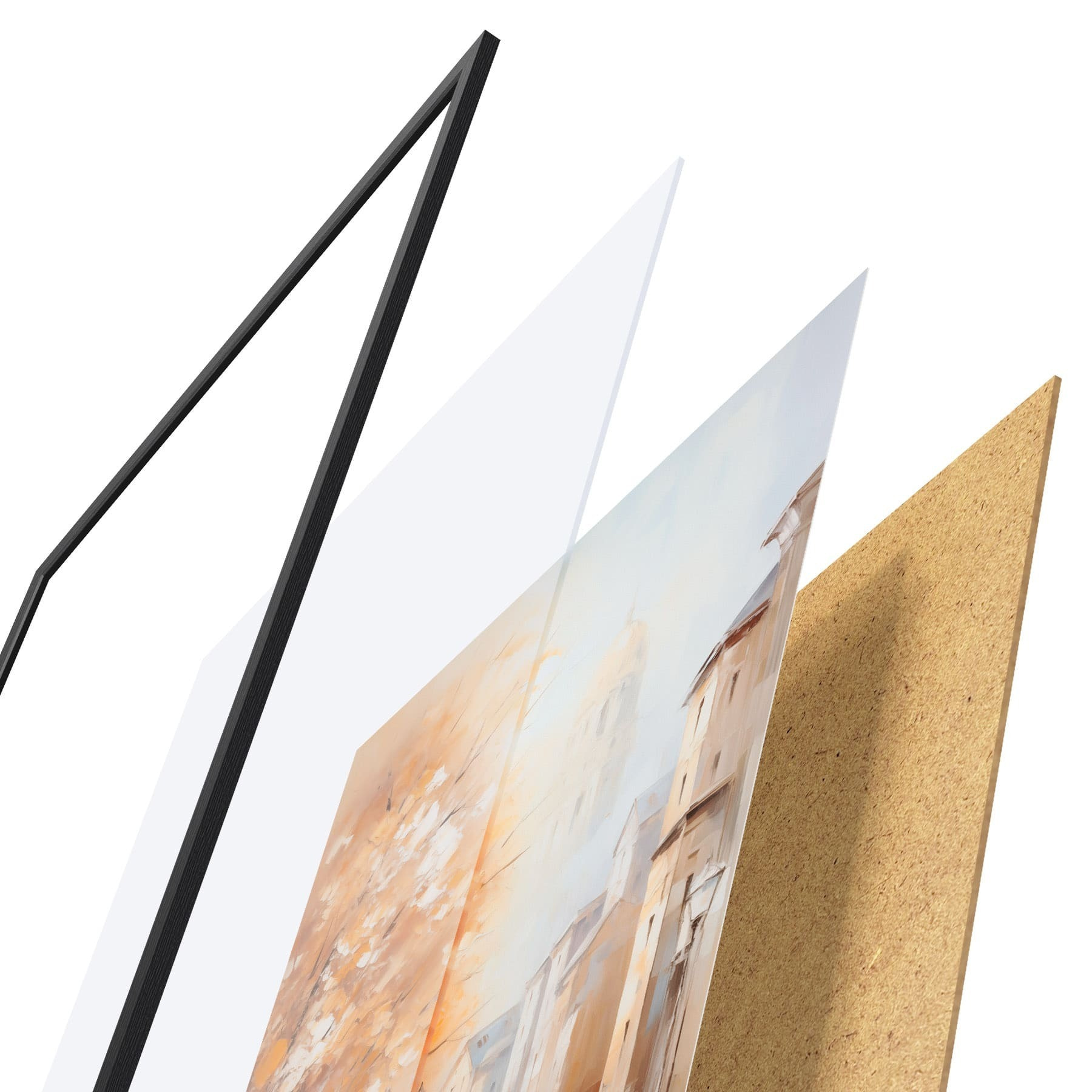 De poster bestaat uit een frame, plexiglas, geprinte afbeelding en spaanplaat achterkant. De poster kan meteen aan de muur worden gehangen dankzij de bevestigingen op de achterkant.